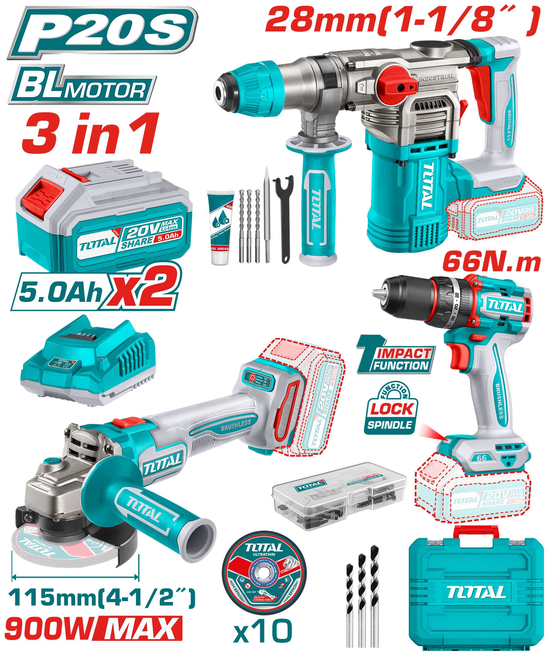 - طقم كومبو 3 في 1 لاسلكي 20 فولت من توتال - بدون فرشاة، مجموعة كاملة