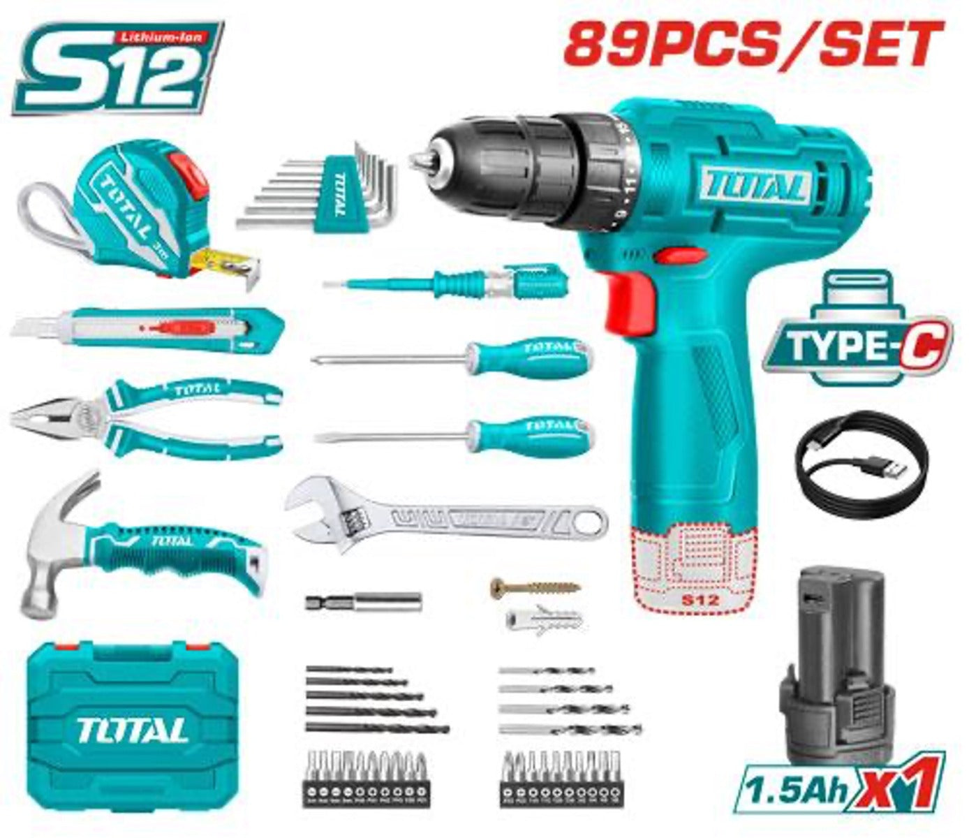 - طقم أدوات مكون من 89 قطعة من توتال مثقاب لاسلكي 12 فولت وملحقات كاملة