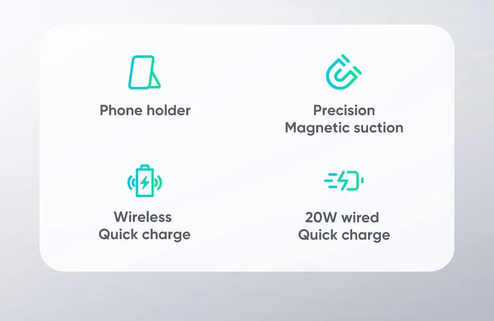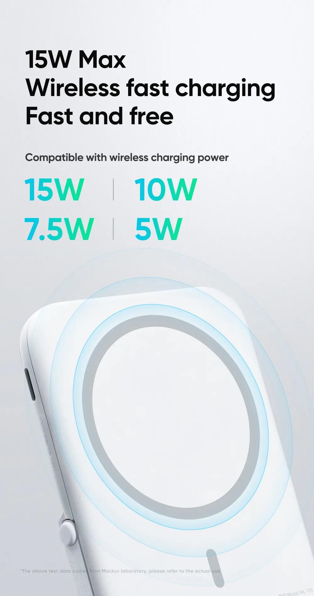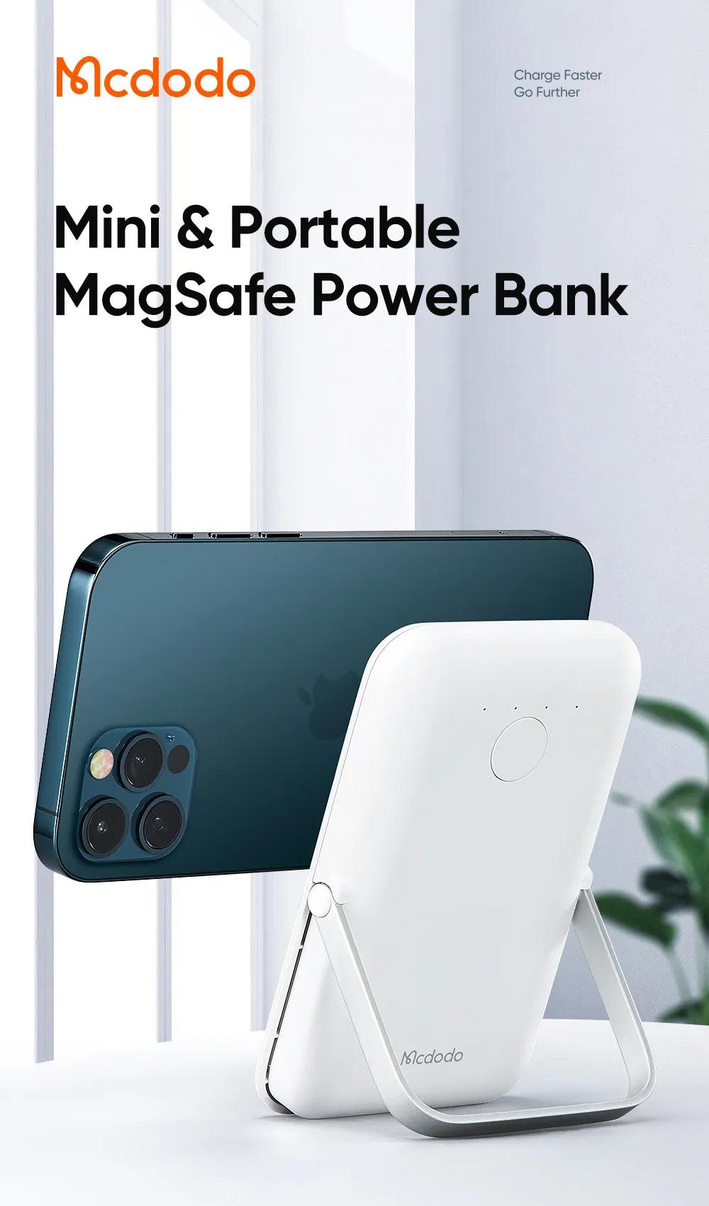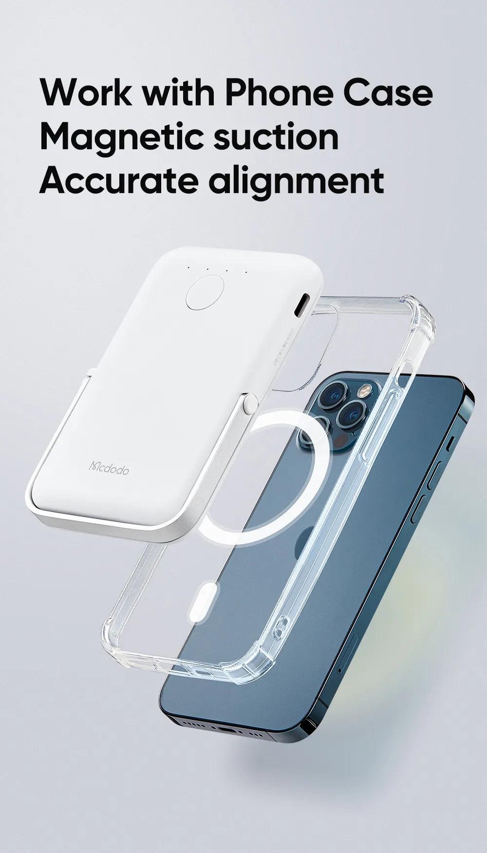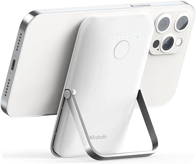 بنك الطاقة مكدودو إم سي-7051 بسعة 5000 مللي أمبير في الساعة وتصميم أبيض أنيق. يتميز بشحن لاسلكي (15 وات، 10 وات، 7.5 وات، 5 وات) ومنافذ يو إس بي سي للإدخال والإخراج، ويدعم الشحن السريع حتى 20 وات يبلغ قياسه 106.6 × 67.3 × 16.6 مم ويزن 145 جرامًا، وهو محمول وصغير الحجم. يتضمن قاعدة تتحول إلى حامل هاتف وتوفر حماية أمان ضد الشحن الزائد والسخونة الزائدة والدوائر القصيرة. غير مناسب للشحن الكامل على ايفون 11 وما فوق.