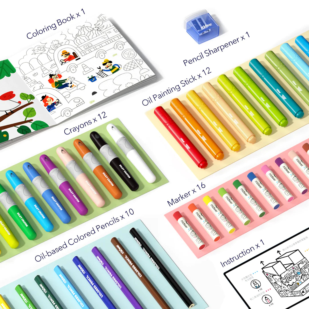 - تشتمل على: 16 قلم تحديد قابل للغسل، 12 عصا طلاء زيتي، 12 قلم تلوين حريري، 10 أقلام رصاص ملونة، 1 مبراة قلم رصاص، 1 كتاب تلوين، 1 تعليمات