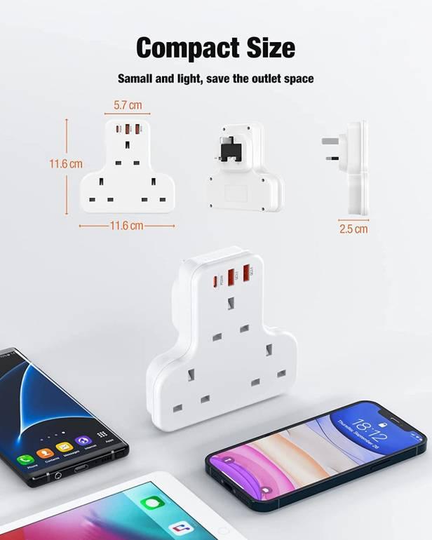 يحتوي على منفذين USB-A ومنفذ USB-C يدعمان الشحن السريع حتى 20 وات (PD) .