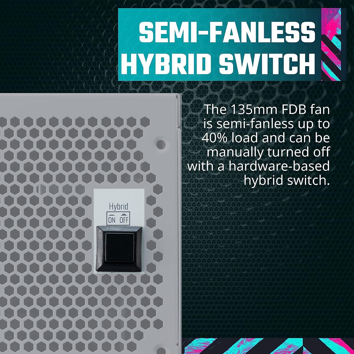 - Semi-Fanless Mode with Hybrid Switch : The 135mm FDB fan is semi-fanless up to 40% load and can be manually turned off with a hardware-based hybrid switch.