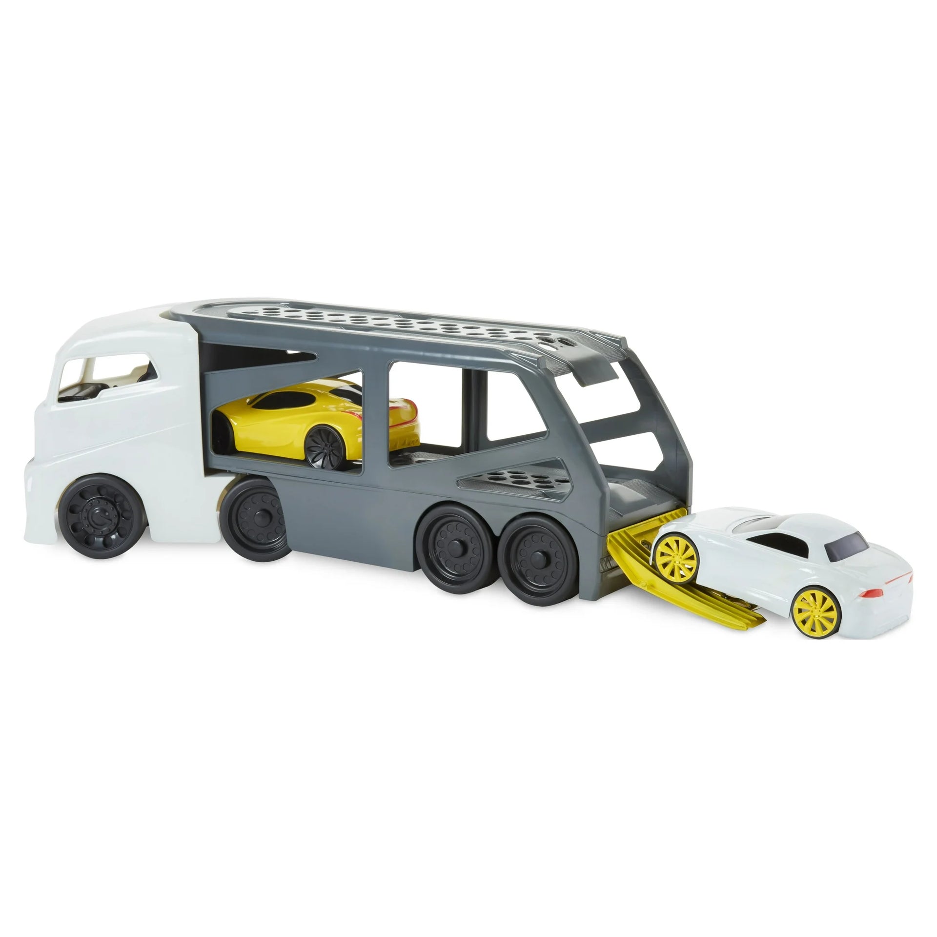 - Interactive Car Carrier: The carrier features a flip-down rear ramp, allowing kids to load and unload cars repeatedly, adding to the fun.
