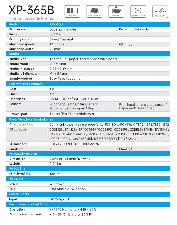 The Xprinter XP-365B is a high-speed thermal printer designed for efficient barcode and receipt printing. Its advanced printing technology ensures clear, precise output, making it ideal for retail, logistics, and healthcare environments. With fast print speeds and reliable performance, it streamlines transaction processes and enhances operational productivity. This model supports various label sizes and is compatible with multiple systems, providing versatile connectivity options for seamless integration into existing setups. Perfect for businesses that demand accuracy and speed in their printing tasks.