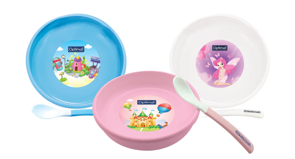 Serve your child’s meals safely and easily with the Optimal Non-Slip Feeding Dish with STP – Blue, Pink, White.