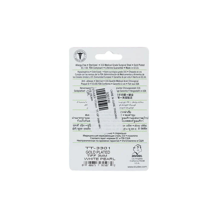 STUDEX TT3301 hypoallergenic earrings feature a classic 3mm white pearl design with gold-plated titanium posts, ideal for sensitive ears and newly pierced lobes. The smooth pearl finish offers timeless elegance suitable for daily wear or special occasions. Titanium construction minimizes irritation risk, making these studs a reliable choice for those prone to allergic reactions. Perfect for layering or wearing solo, these versatile earrings deliver understated sophistication with professional-grade durability.