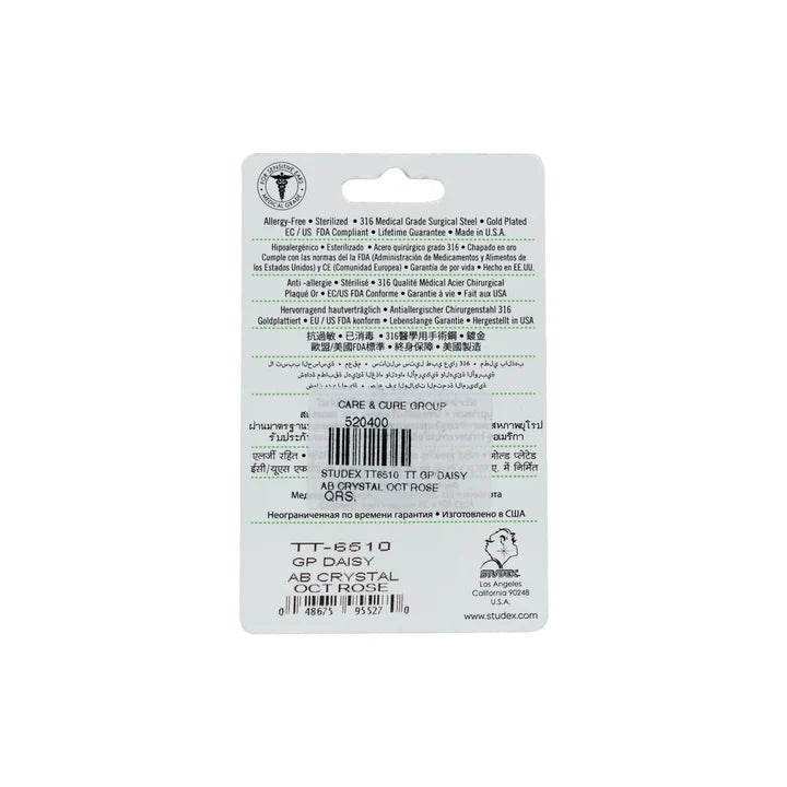 STUDEX TT6510 TT GP Daisy AB Crystal Oct Rose Earrings feature delicate daisy-shaped studs adorned with Aurora Borealis crystals in a warm rose tone. Crafted with gold-plated surgical steel posts, these hypoallergenic earrings are ideal for sensitive ears and newly pierced lobes. The octagonal crystal faceting creates brilliant light-play, while the refined daisy motif adds timeless elegance. Perfect for everyday wear or special occasions, these studs combine durability with sophisticated sparkle.