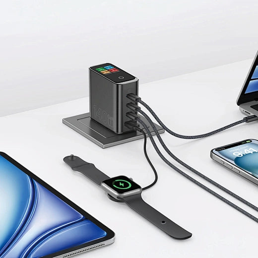 Meet the ultimate charging station for your entire tech arsenal. The WiWU Wi-G028 is a powerhouse adapter that combines a massive 140W max output with the intelligence of a dynamic display screen. Powered by advanced GaN technology, it delivers faster, more efficient charging in a compact form factor. The innovative screen gives you a real-time, visual confirmation of power output and temperature, so you're always in control. With three USB-C ports and one USB-A port, it can fast charge your laptop, phone, tablet, and accessories all at once, eliminating clutter and waiting. Built for durability and certified for global safety standards, this is the only charger you'll ever need.